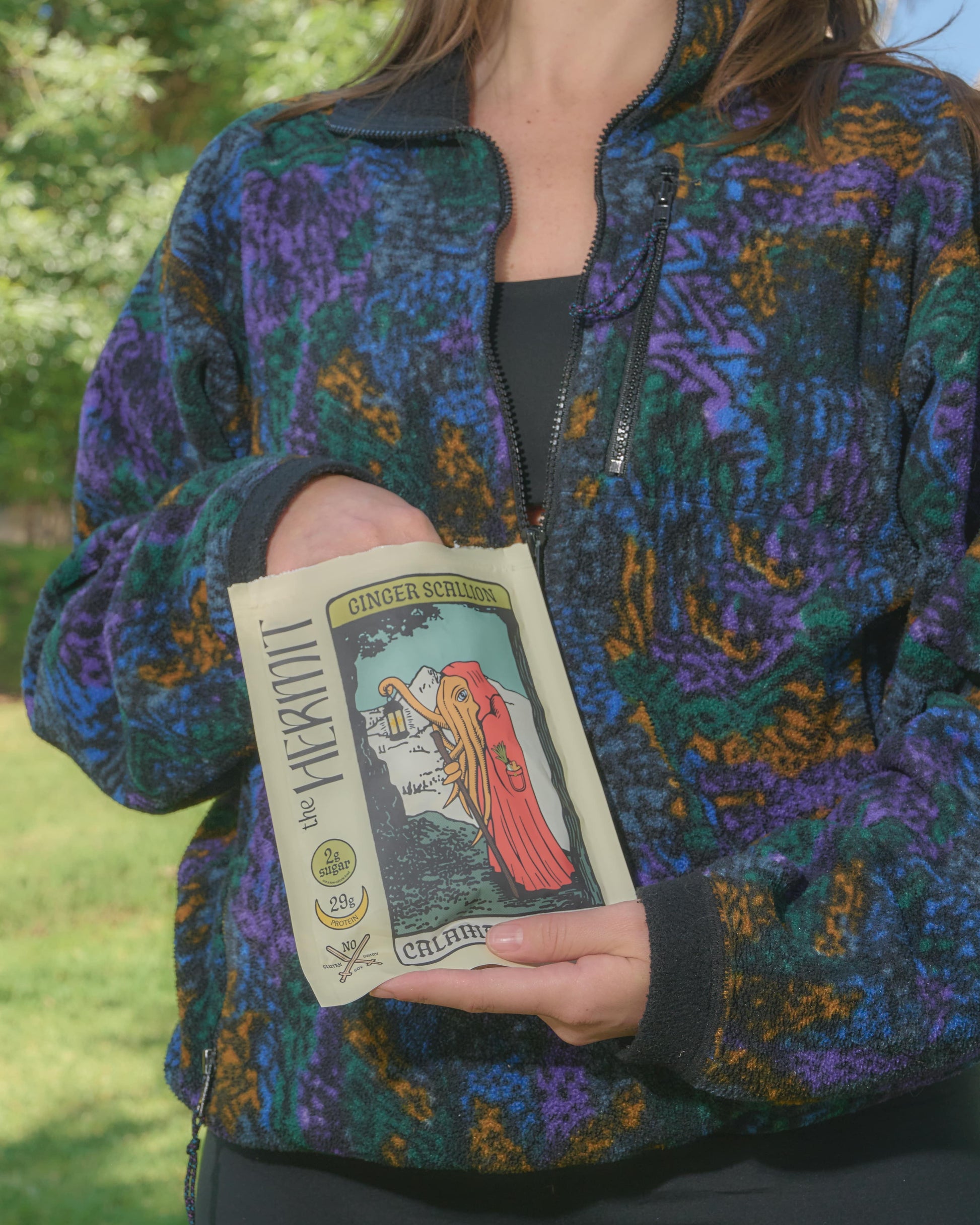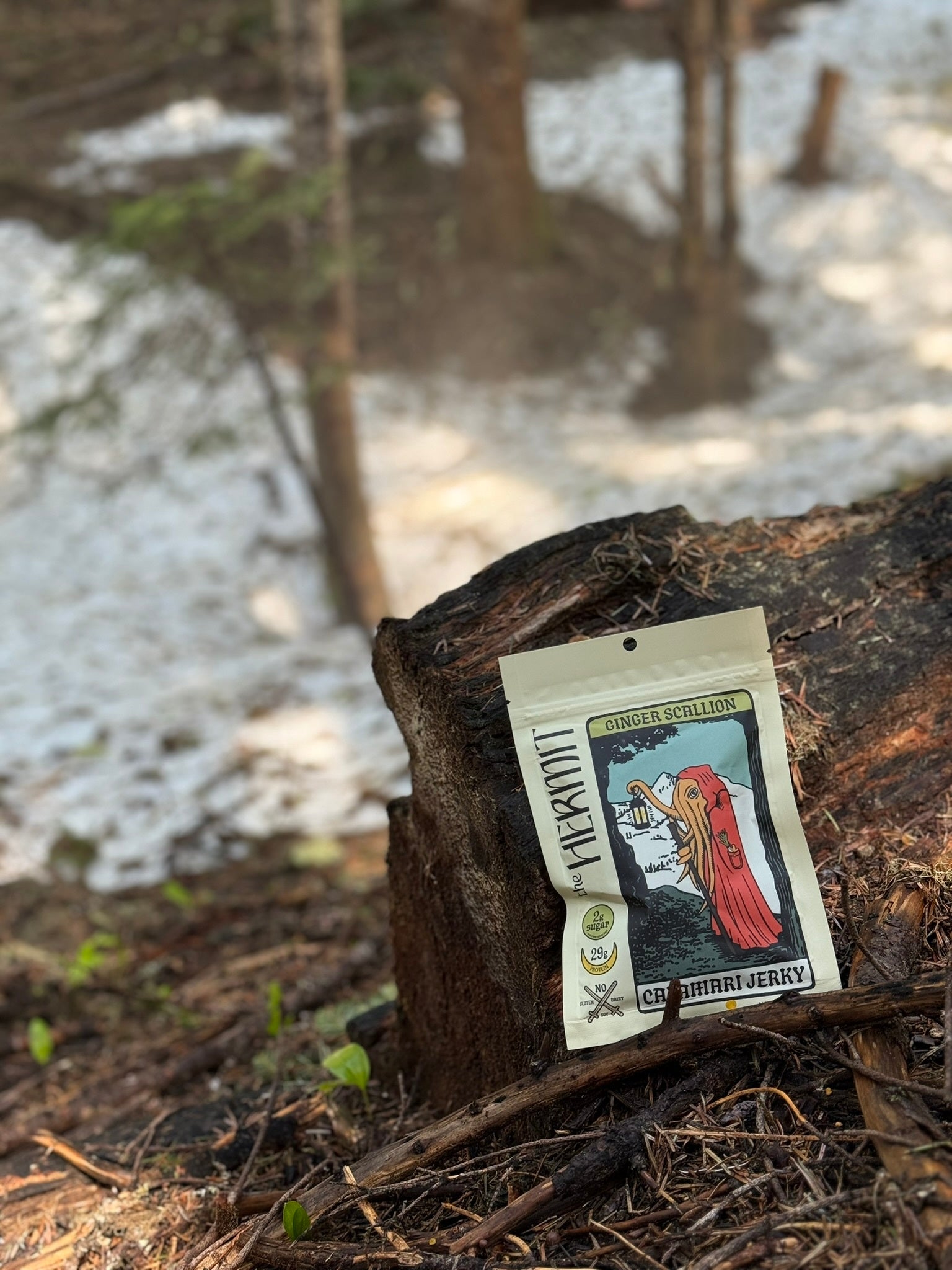 On a quest through the heart of mountainous Szechuan, The Hermit finds himself in an isolated hut perched atop a mountain canyon. The air inside is replete with the warming spice of ginger, balanced with the refreshing bite of green onion. Our Ginger Scallion squid jerky embodies this savory harmony, infused with a touch of umami from fish sauce.